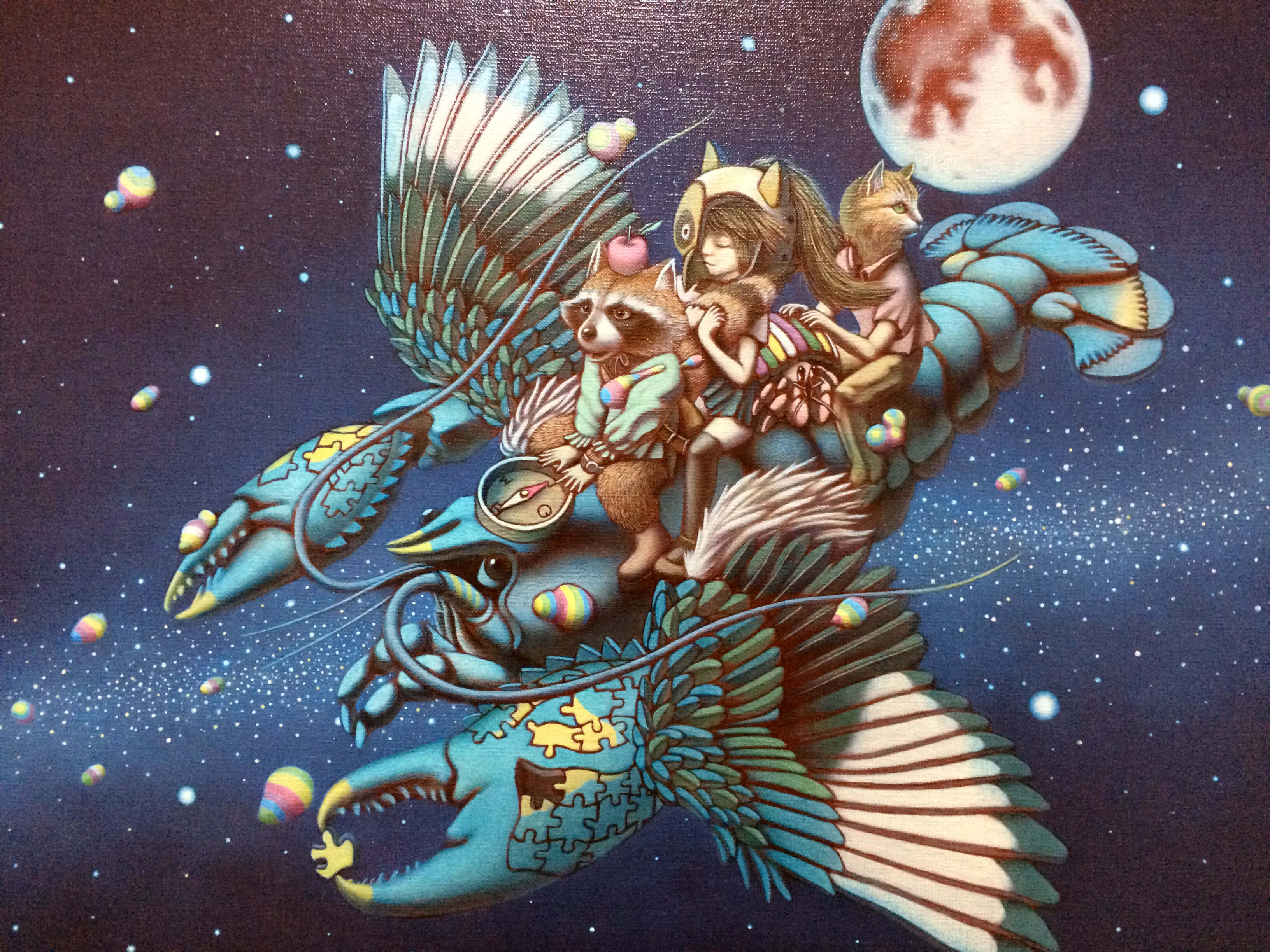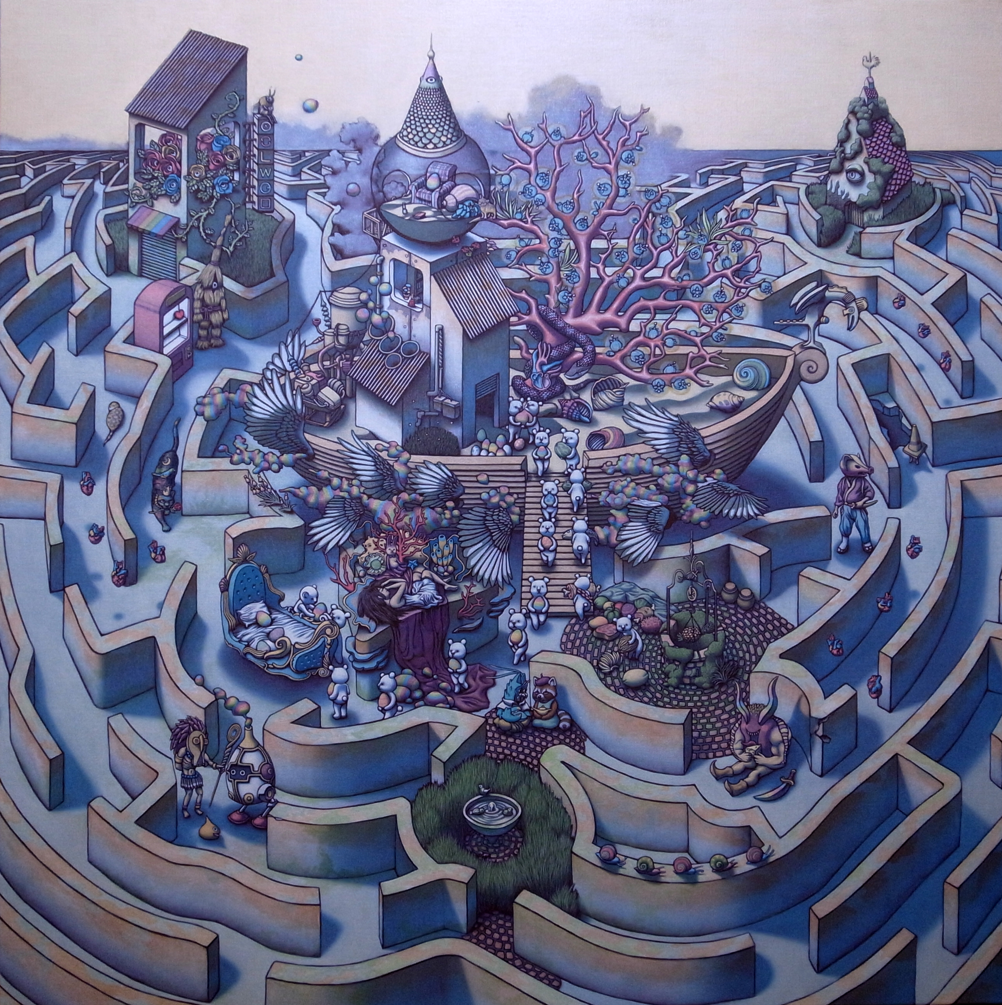 我一直以來都希望可以畫出夢境世界,來表達真實存在的心理狀態。這個世界後 來在我心中變成一個形而上的存在:「夢境的烏托邦」,夜間的夢境與白日夢的想 像融合在一起了。 迷宮與沙漠是隱藏在我心中的神聖場所,具有私密、寧靜與孤獨的狀態。我認為 這個象徵化的聖域,是收納著回憶的背景世界。 對於我常常夢見的人物,我給他們取了「四個夢境旅人」的名字:龍蝦先生、浣 熊小姐、蟹國公主、虎斑貓,似乎他們以我的感情與記憶為養分,化為夢境世界 裡的居民。在創作狀態的想像下,我便以他們作為夢境世界的主角。 我試圖在「夢境的烏托邦」呈現一個具像、可理解的想像世界,同時也是真實存 在於內心角落的自由世界。